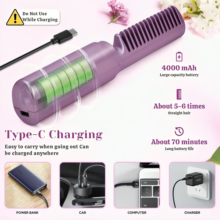 - Portability: Perfect for travel, this mini hair straightener comb is rechargeable and cordless, allowing you to use it without the hassle of cords and plugs.